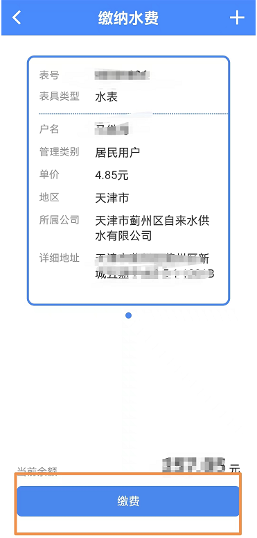 進(jìn)入繳納水費(fèi)界面,如果綁定了多塊水表,左右滑動選擇要繳納水費(fèi)的表具后點擊繳費(fèi)按鈕。如圖