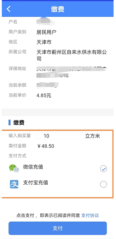 在繳費(fèi)之前請核對表具信息輸入購買噸數(shù),支付方式支持微信和支付寶兩種方式。選擇輸入完畢之后點擊支付。如圖