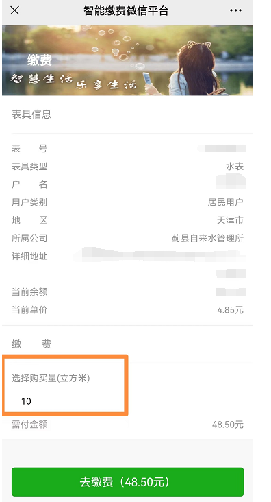 點(diǎn)擊繳費(fèi)充值,如果綁定了多塊水表,左右滑動(dòng)選擇要繳納水費(fèi)的表具后點(diǎn)擊繳費(fèi)按鈕。如圖