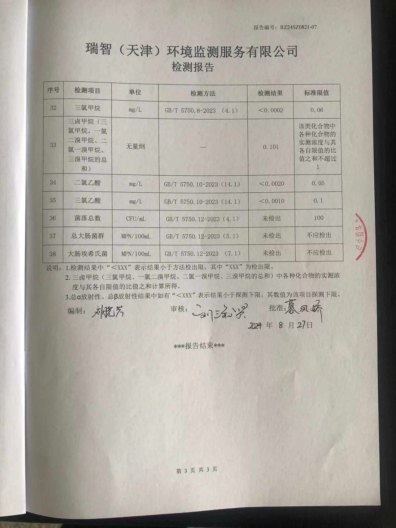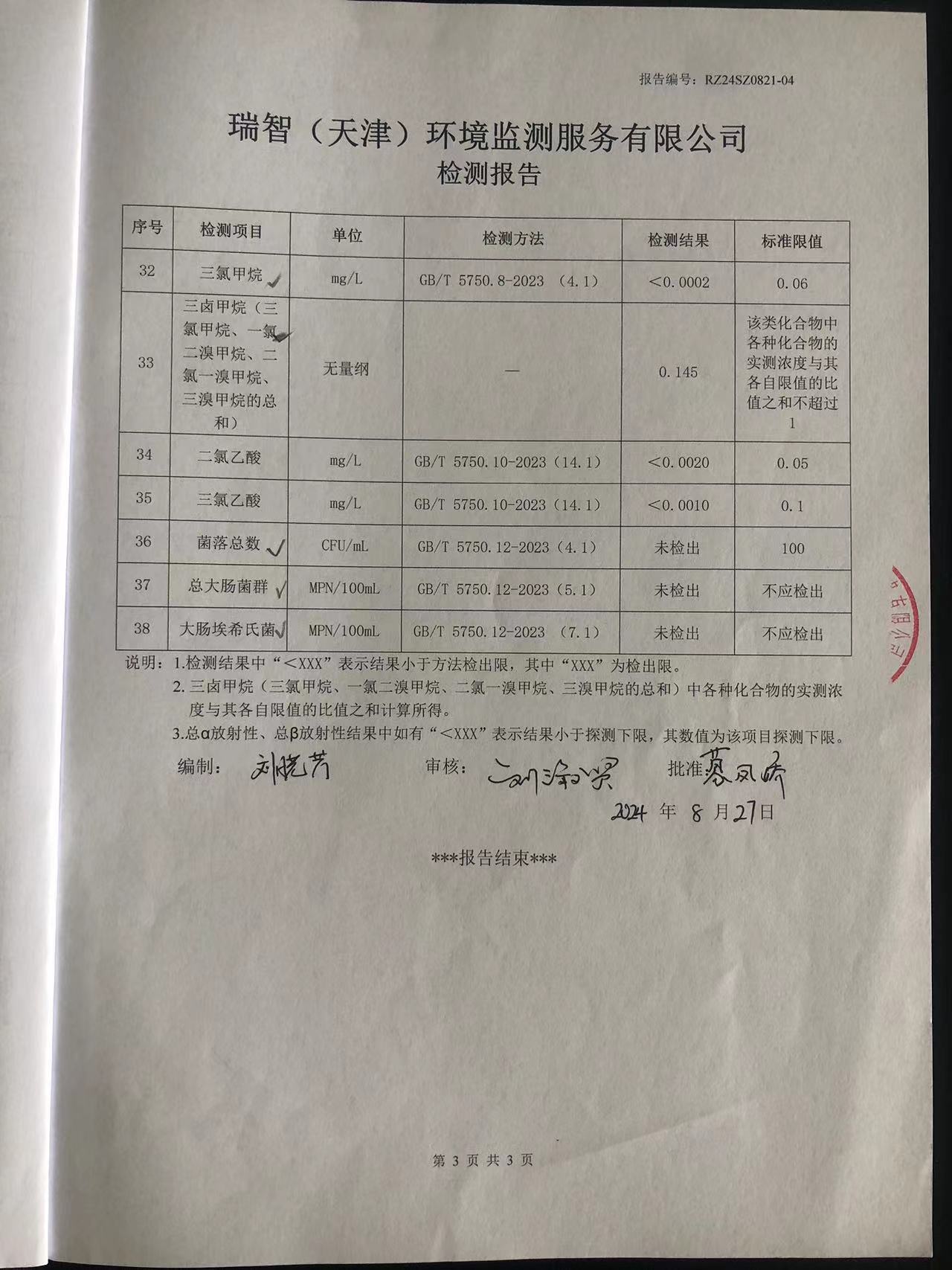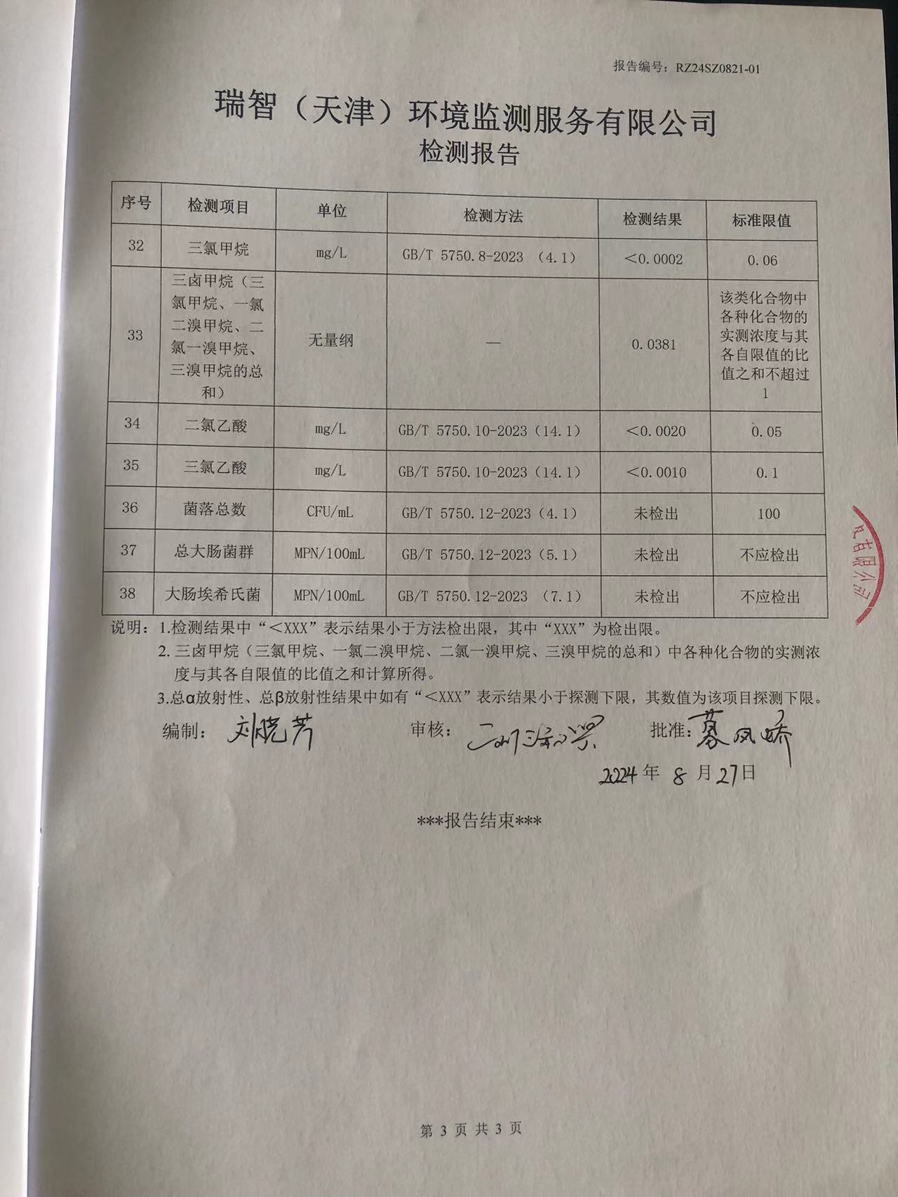 2024年8月份水質(zhì)檢測報告