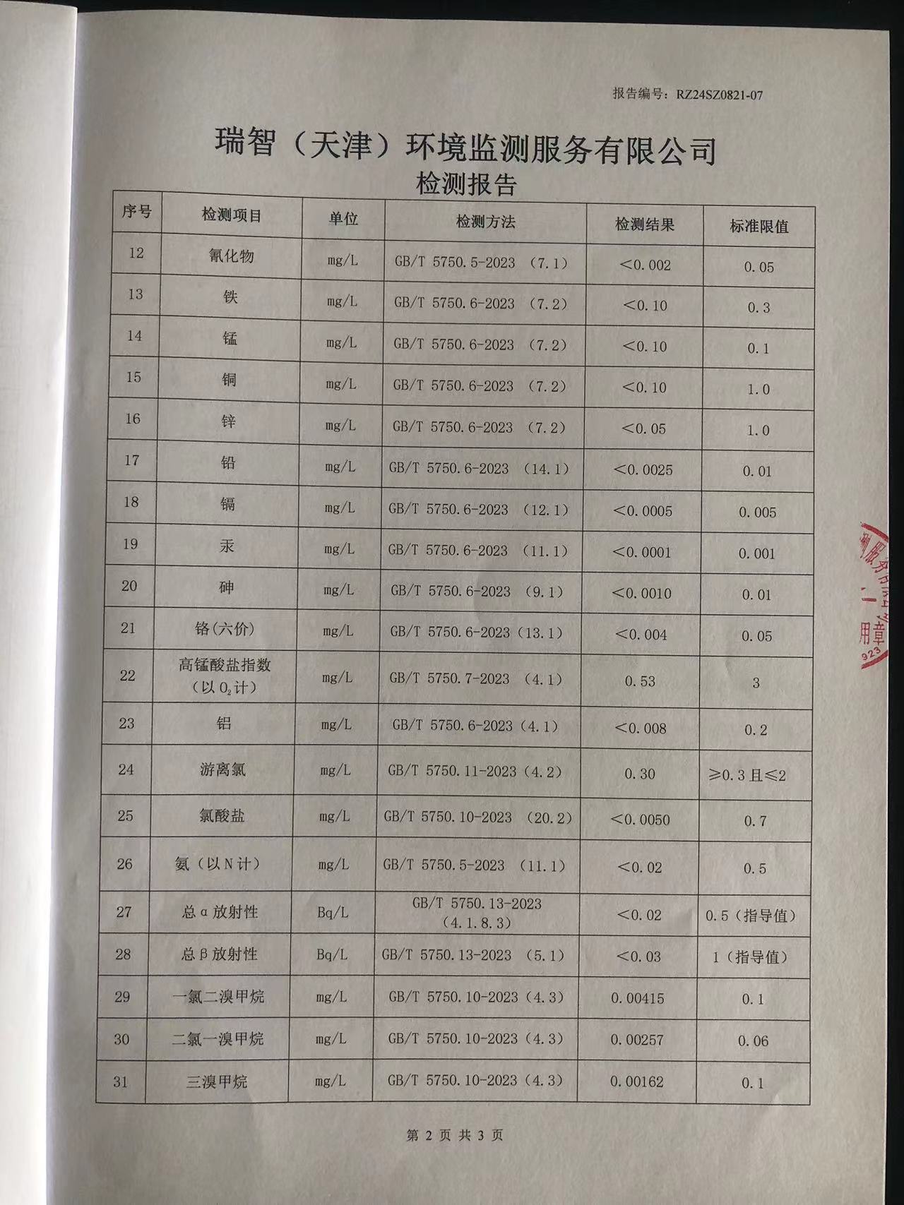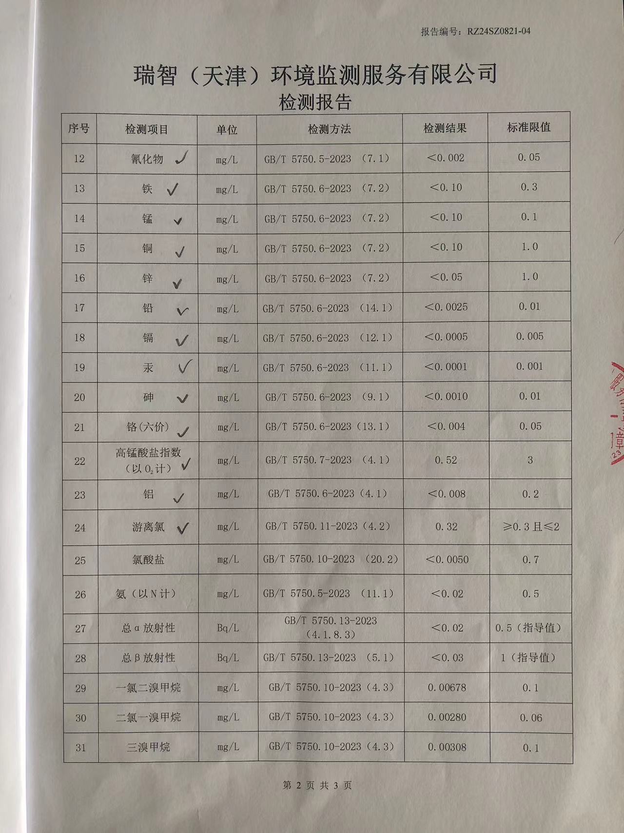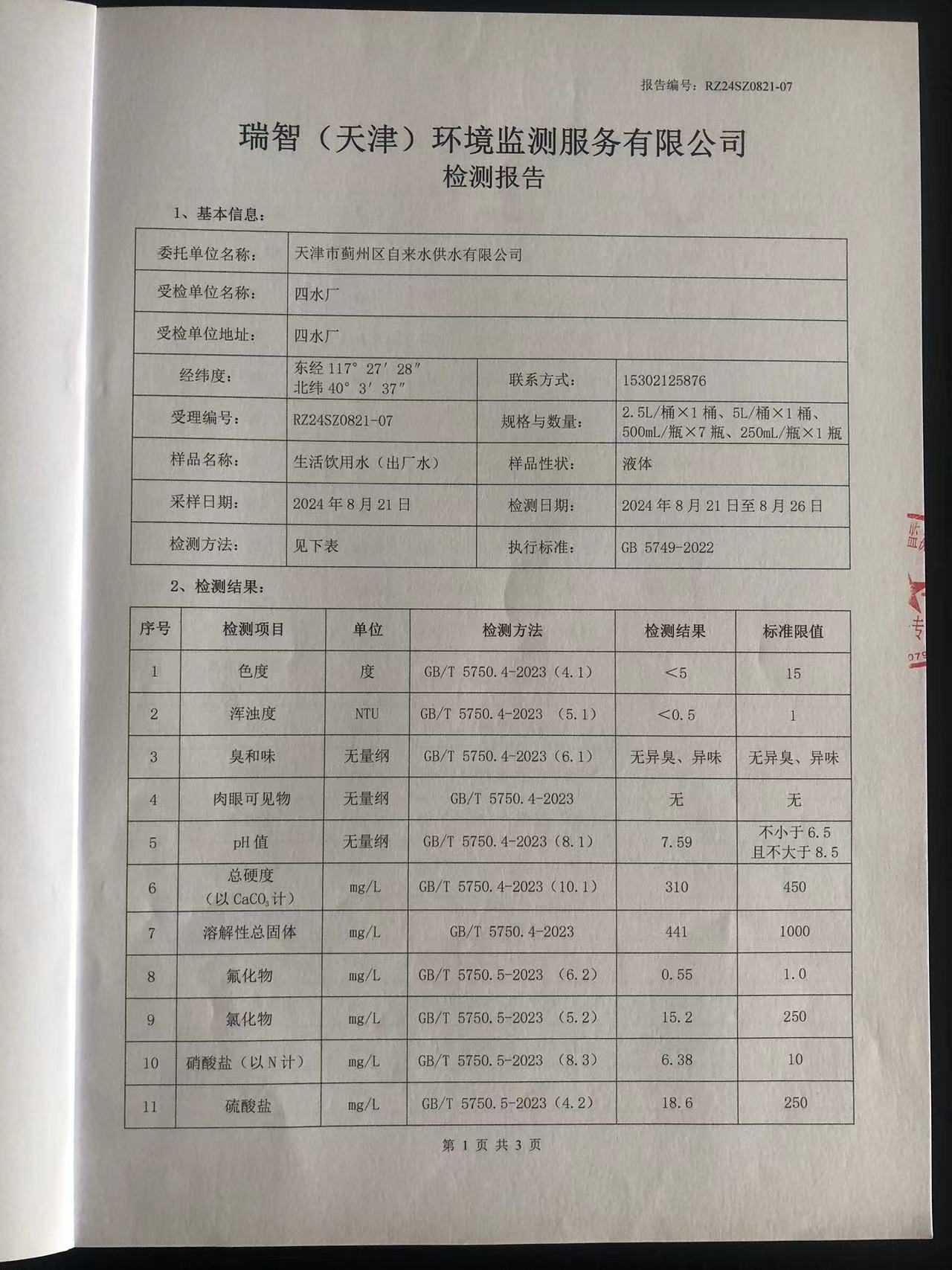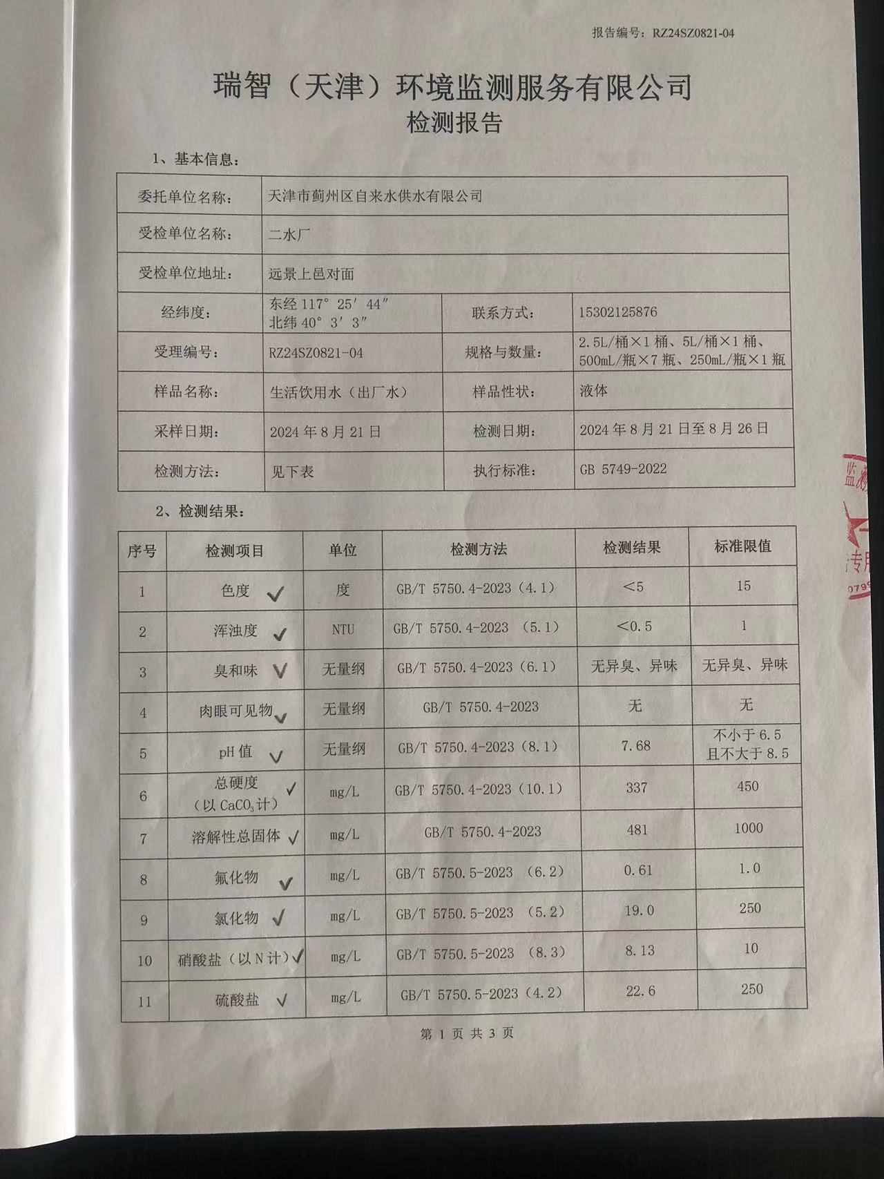 2024年8月份水質(zhì)檢測報告