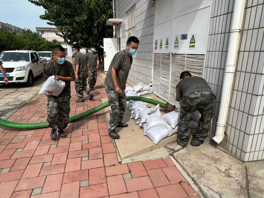 上圖為防汛搶險隊用沙袋搭建圍堰并鋪設排水管道